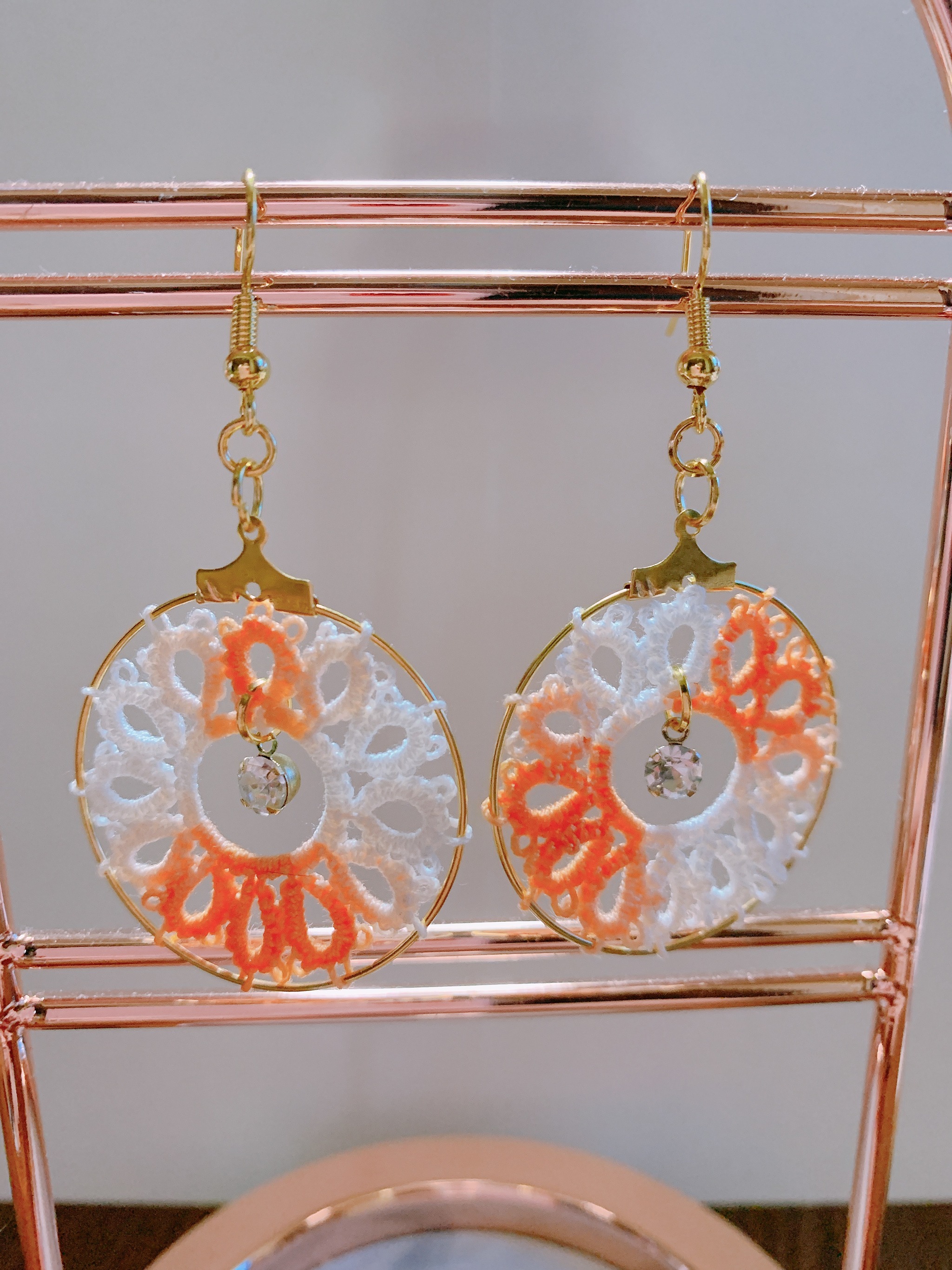 #日輪草 #タティングレース #ピアス #イヤリング #ひまわり #向日葵 #フープピアス #フープイヤリング #ビジュー #ラインストーン #夏 #太陽 #フープ #グラデーション #オレンジ